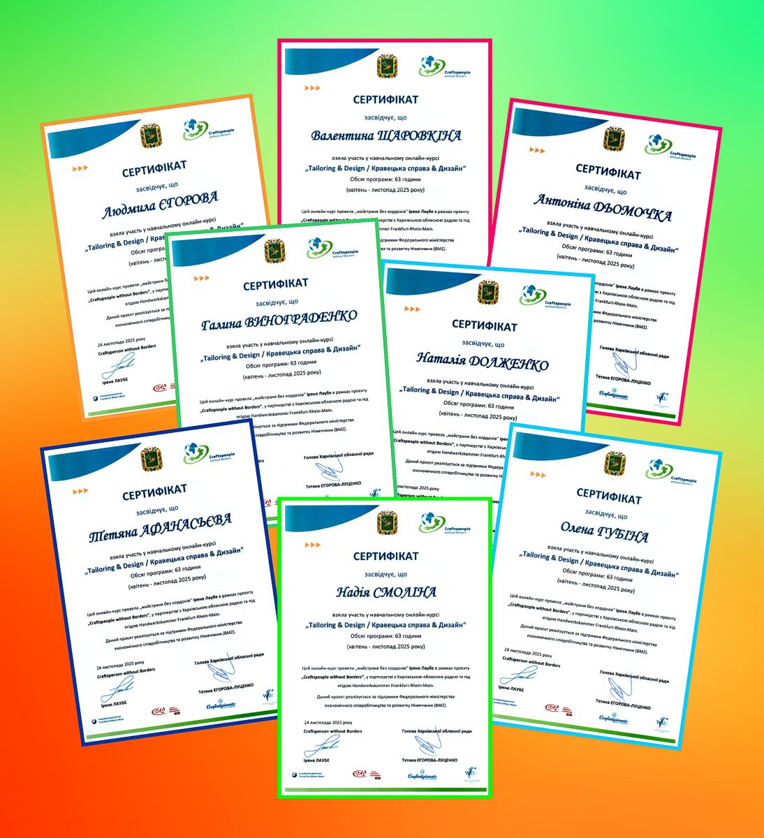 27.11.2025 відбулось урочисте вручення сертифікатів слухачам курсів в рамках німецько-українського проєкту «Ремісники без кордонів» за участі заступниці голови Харківської обласної ради Валерії Дзюби та  менеджера проєкту «Craftspeople without Borders» пана Маркуса ЕЙХЕРА (онлайн).
