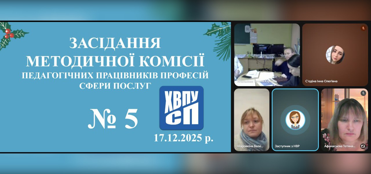 17.12.2025 в Харківському вищому професійному училищі сфери послуг було проведене засідання методичної комісії педагогічних працівників із професій сфери послуг – «Касир (в банку)», «Оператор поштового зв’язку», «Манікюрник. Педикюрник», «Візажист», «Адміністратор» під головуванням Апалькової Тетяни та у присутності адміністрації училища, присвячене підведенню підсумків освітнього процесу за І-й семестр 2025-2026 н.р.