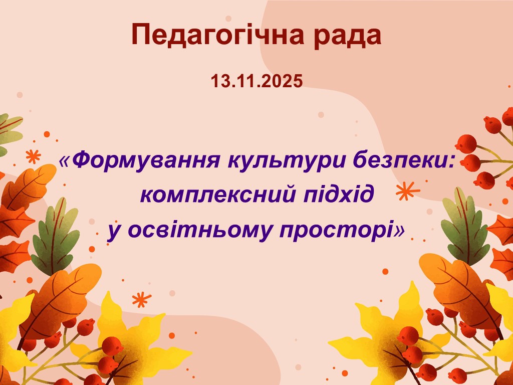 13 листопада 2025 року в нашому освітньому закладі відбулося засідання педагогічної ради на актуальну тему «Формування культури безпеки: комплексний підхід у освітньому просторі». Захід пройшов у форматі онлайн.