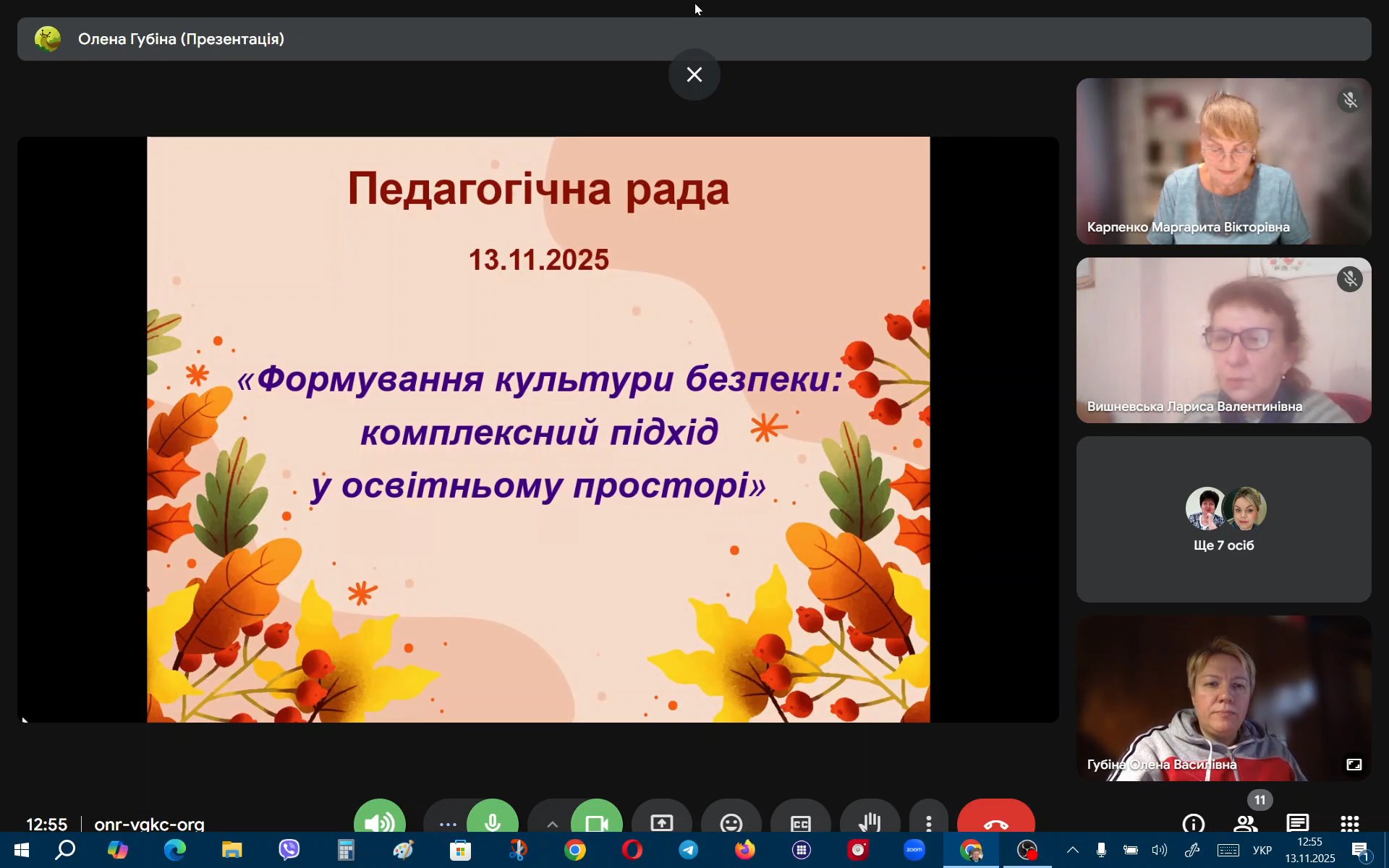13 листопада 2025 року в нашому освітньому закладі відбулося засідання педагогічної ради на актуальну тему «Формування культури безпеки: комплексний підхід у освітньому просторі». Захід пройшов у форматі онлайн.