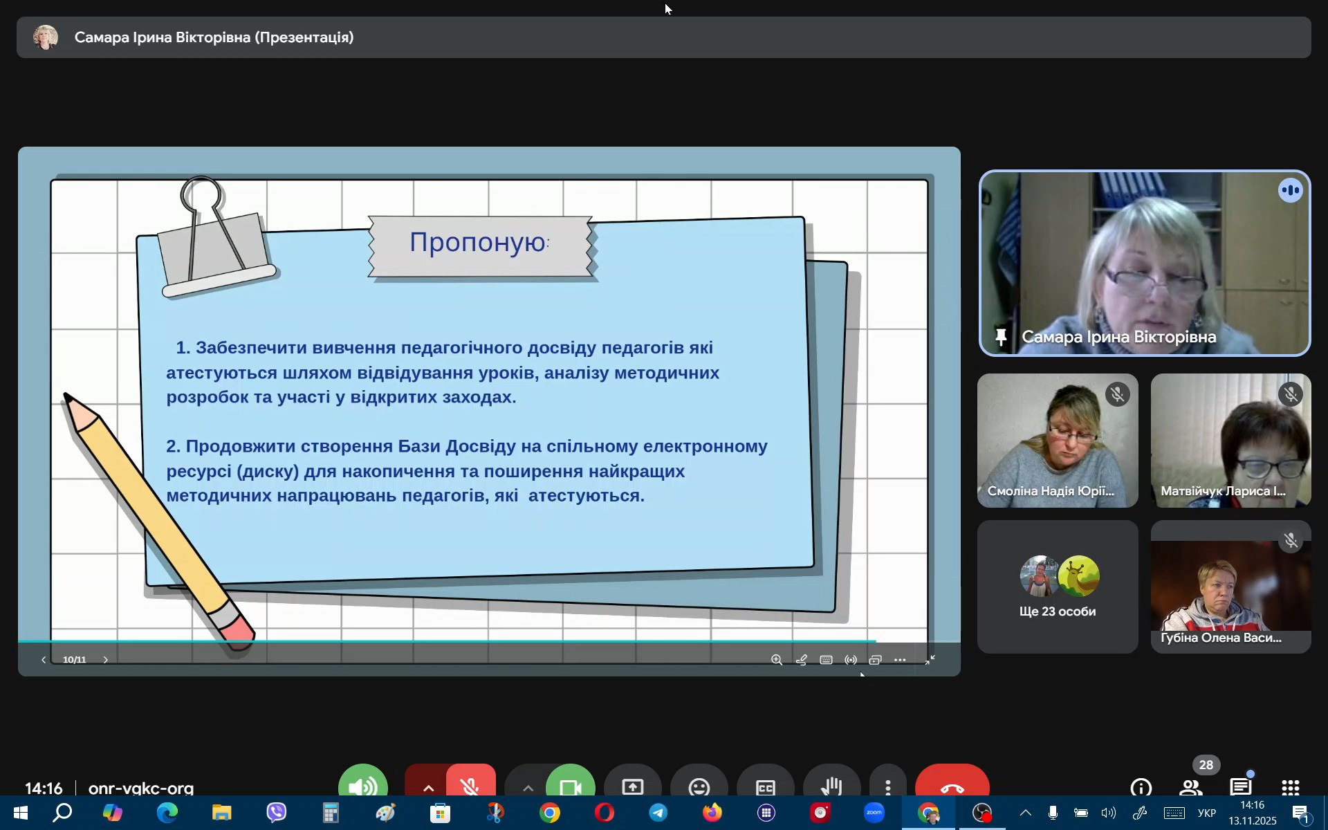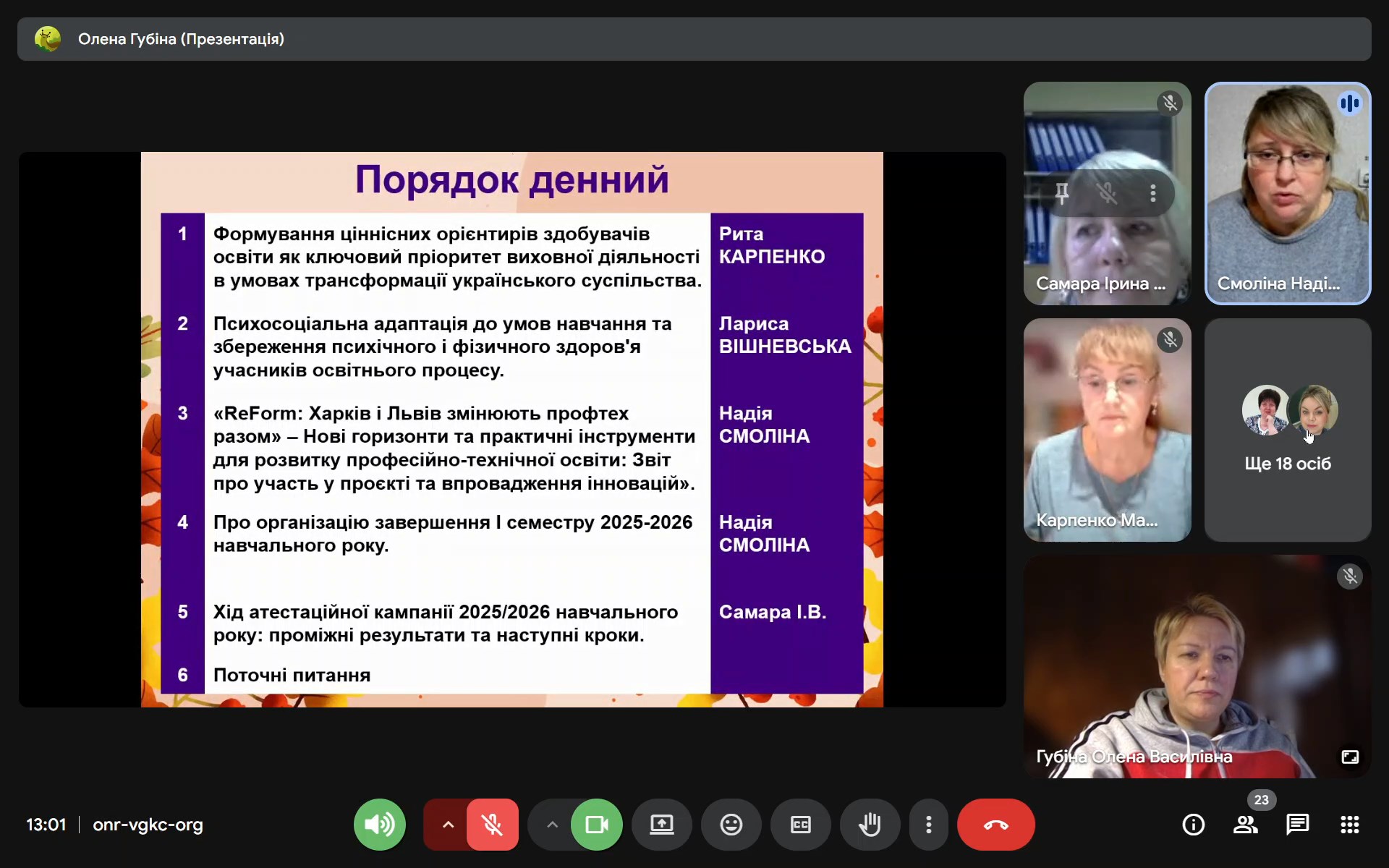 - Секретар атестаційної комісії Ірина Самара представила аналітичну довідку про хід атестації у 2025/2026 н.р. Заплановано вивчення педагогічного досвіду тих, хто атестується, і продовження створення Бази Досвіду на спільному електронному ресурсі.