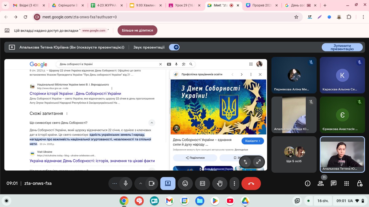 З нагоди Дня Соборності України в училищі проведено виховні години у навчальних групах, під час яких студенти ознайомилися з історичними подіями 22 січня 1919 року, значенням Акту Злуки, обговорили цінності соборності, громадянської відповідальності та любові до Батьківщини.
