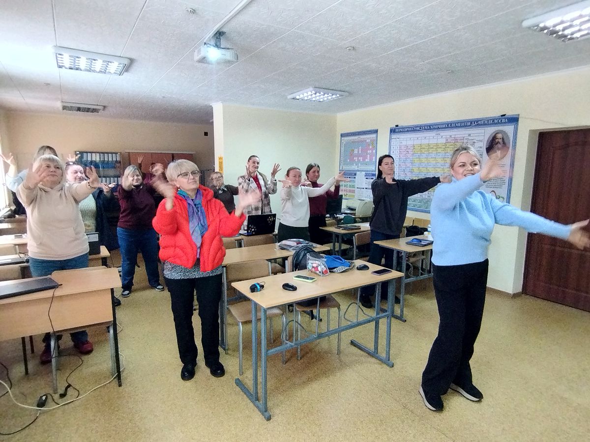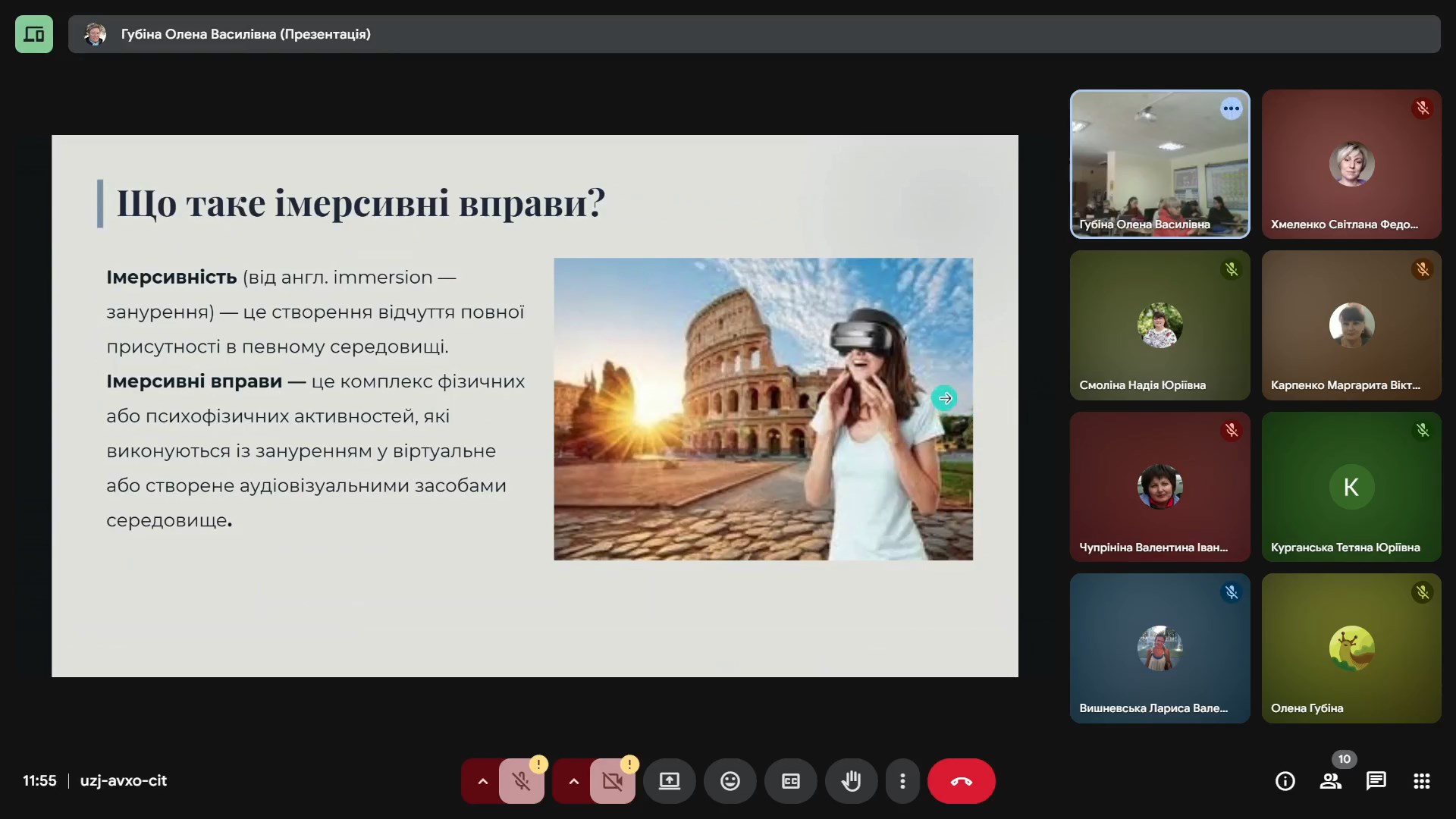 Викладач фізичної культури Шитєєва Ольга Володимирівна ознайомила колег з темою «Імерсивні вправи як засіб релаксації та відновлення під час дистанційного навчання», яка є особливо актуальною в умовах «екранної втоми», гіподинамії та психічного стресу. Імерсивні вправи допомагають відволіктися від побутового шуму та домашніх завдань, що особливо важливо при дистанційному навчанні. Колеги спробували виконати запропоновані імерсивні вправи на практиці та дізналися про: