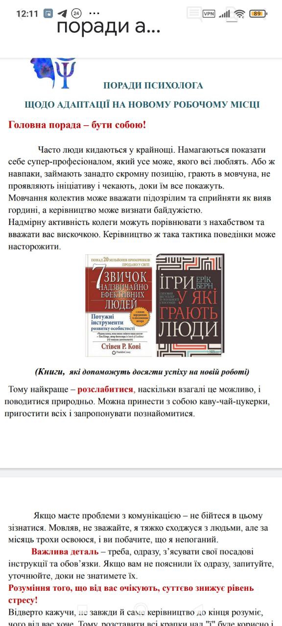 • «Психологічна та емоційна підтримка під час воєнних дій (практичні поради психолога)» (практичний психолог ВИШНЕВСЬКА Лариса).
