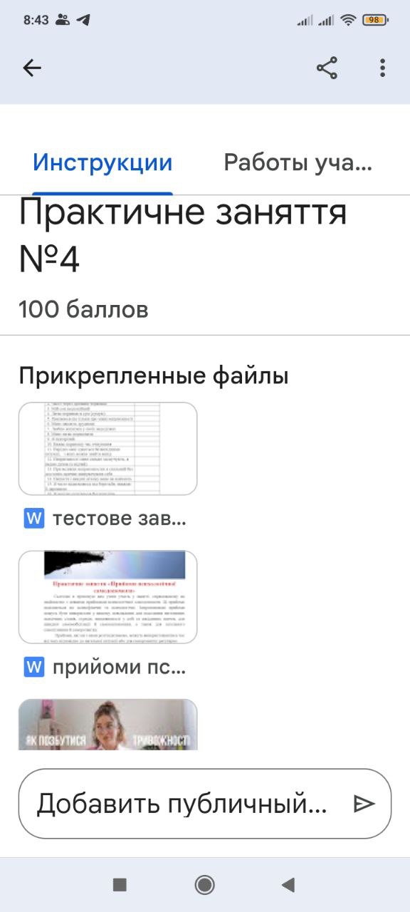 Професійне становлення особистості людини та пошук свого місця серед людей лежить через пізнання себе самого та, в значній мірі, залежить від того, як людина сама себе оцінює. З метою попередження негативних наслідків психотравмуючих факторів, профілактики нервово-психічних і психосоматичних порушень, поліпшення настрою й розумової працездатності на єдиній електронній освітній платформі GooglКласс, в онлайн – кабінеті практичного психолога було запропоновано практичне заняття для здобувачів освіти.