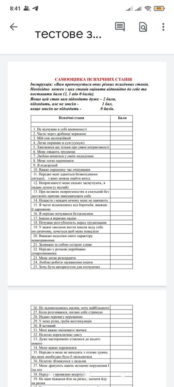 Враховуючи ці особливості, учням І курсу було запропоновано тестове завдання «Самооцінка психічних станів», яке дозволяє оцінити деякі неадаптивні стани (тривога, фрустрація, агресія), які можуть негативно впливати на процес соціалізації та формування самооцінки. Більшість здобувачів освіти виявили низький та середній рівень таких станів, як агресія та ригідність. Проте, 30 % мають високі показники тривожності та фрустрації.