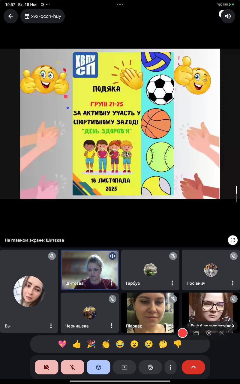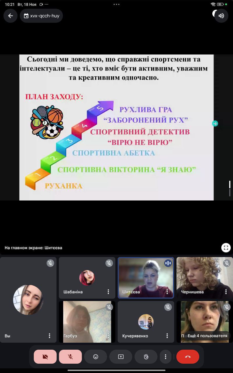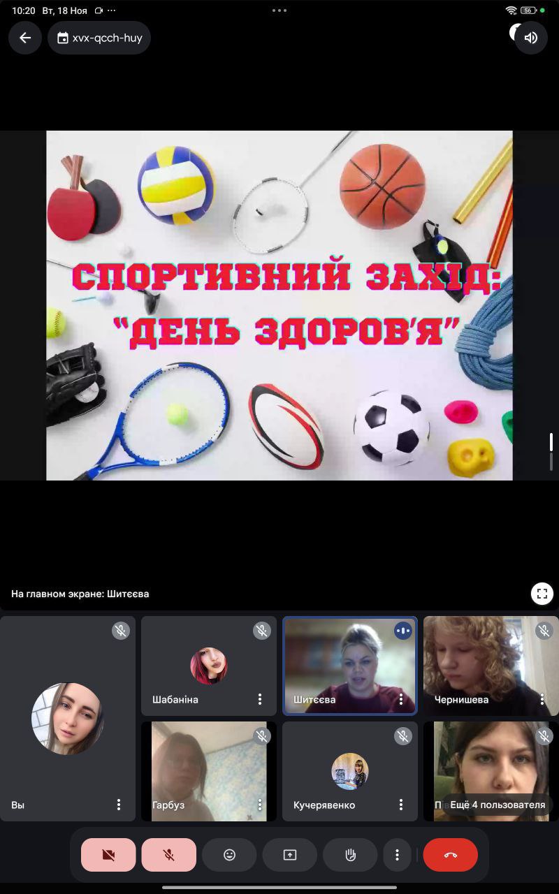 18 листопада 2025 року викладач фізичної культури Ольга Шитєєва провела відкритий спортивний захід «День Здоров’я» зі студентами групи 21-25, який відбувся в онлайн-форматі на платформі Google Meet.