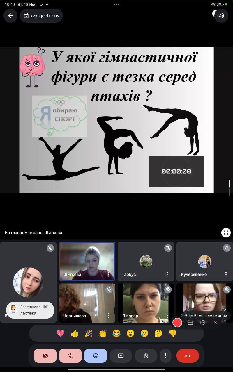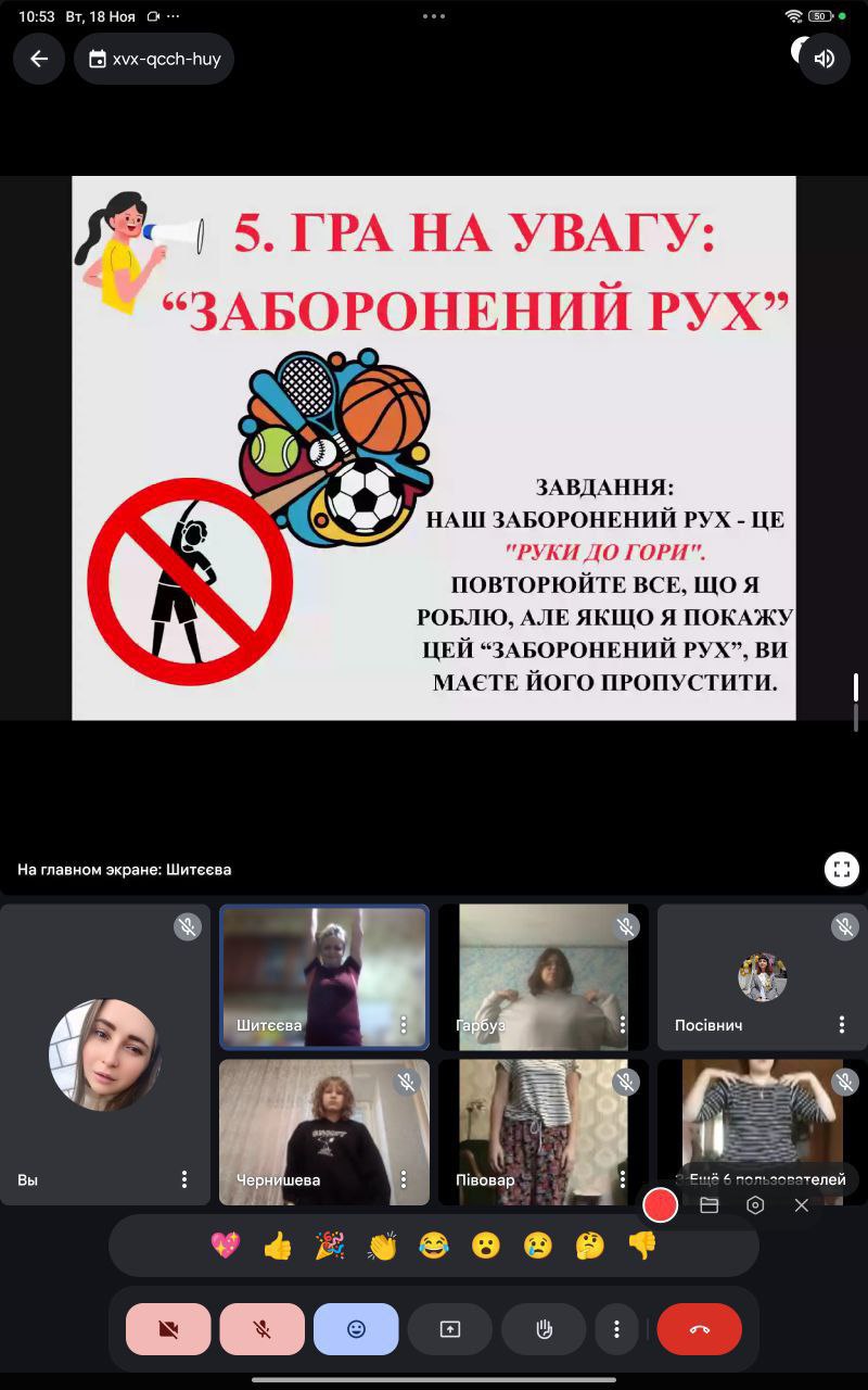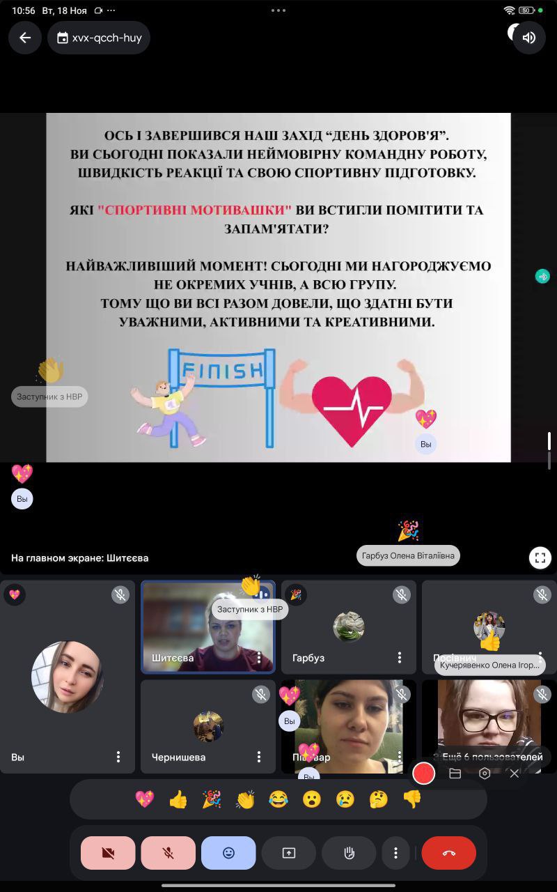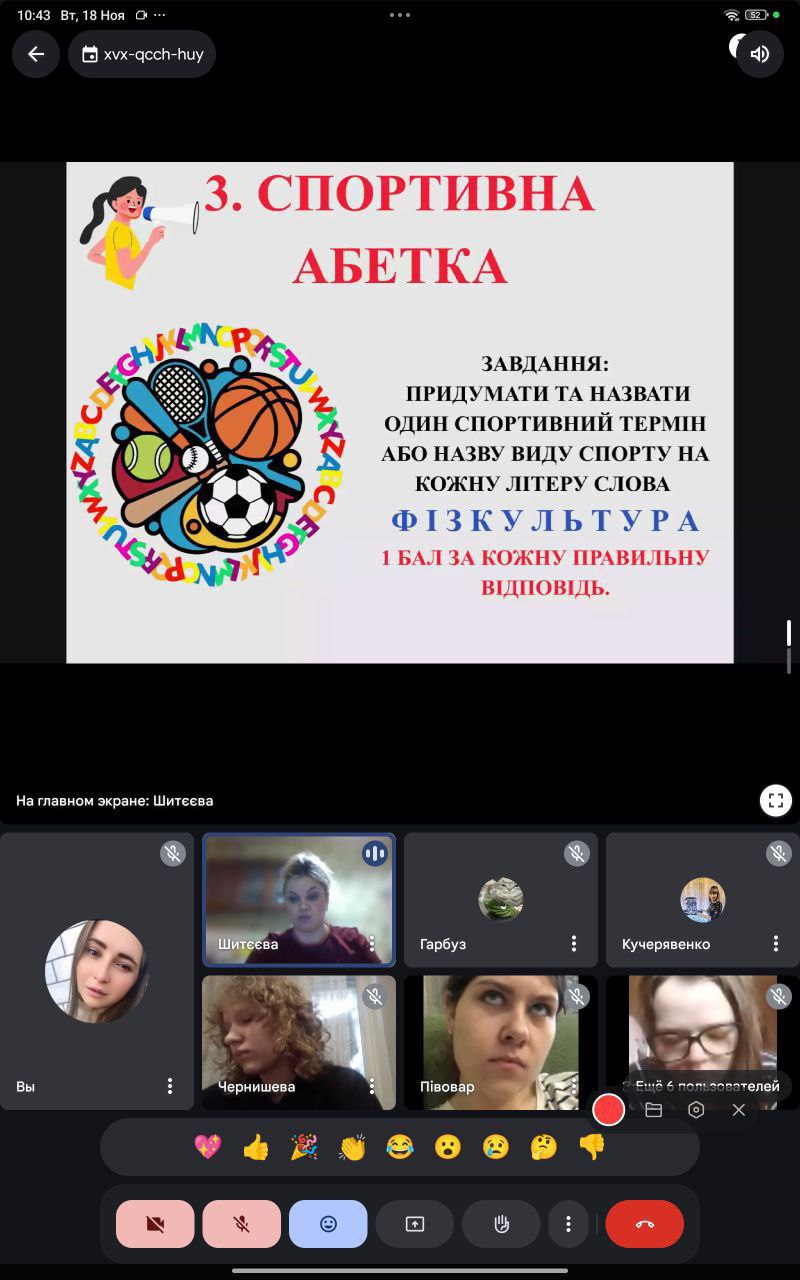 18 листопада 2025 року викладач фізичної культури Ольга Шитєєва провела відкритий спортивний захід «День Здоров’я» зі студентами групи 21-25, який відбувся в онлайн-форматі на платформі Google Meet.