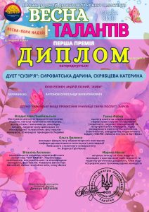 У ІІ Міжнародному двотуровому конкурсі мистецтв «Весна талантів», що відбувся 5 березня 2026 року в місті Києві, гідно представили свій навчальний заклад талановиті студенти. Дует «Сузір’я» у складі Сироватської Дарини та Скрябцевої Катерини продемонстрував високий рівень вокальної майстерності та сценічної культури. У номінації «Естрадний вокал» учасниці виконали композицію «Живи», яка справила яскраве враження на членів журі.