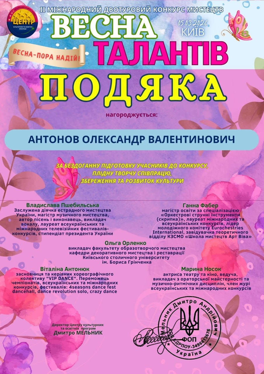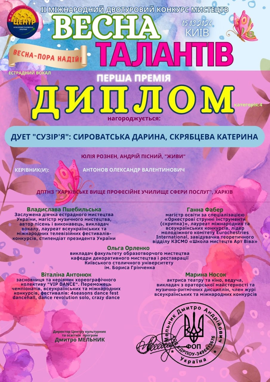 У ІІ Міжнародному двотуровому конкурсі мистецтв «Весна талантів», що відбувся 5 березня 2026 року в місті Києві, гідно представили свій навчальний заклад талановиті студенти. Дует «Сузір’я» у складі Сироватської Дарини та Скрябцевої Катерини продемонстрував високий рівень вокальної майстерності та сценічної культури. У номінації «Естрадний вокал» учасниці виконали композицію «Живи», яка справила яскраве враження на членів журі.