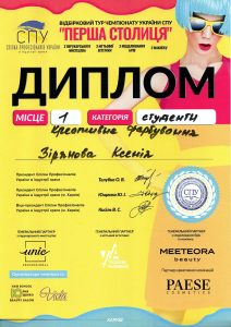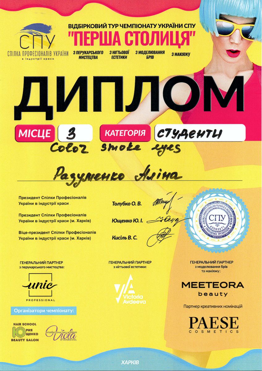 - Разуменко Аліна – 3 місце в номінації «Колор смокі-айс» (візаж)