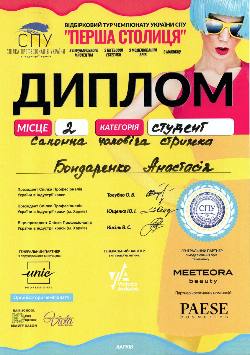- Бондаренко Анастасія – 2 місце в номінації «Салонна чоловіча стрижка»