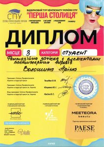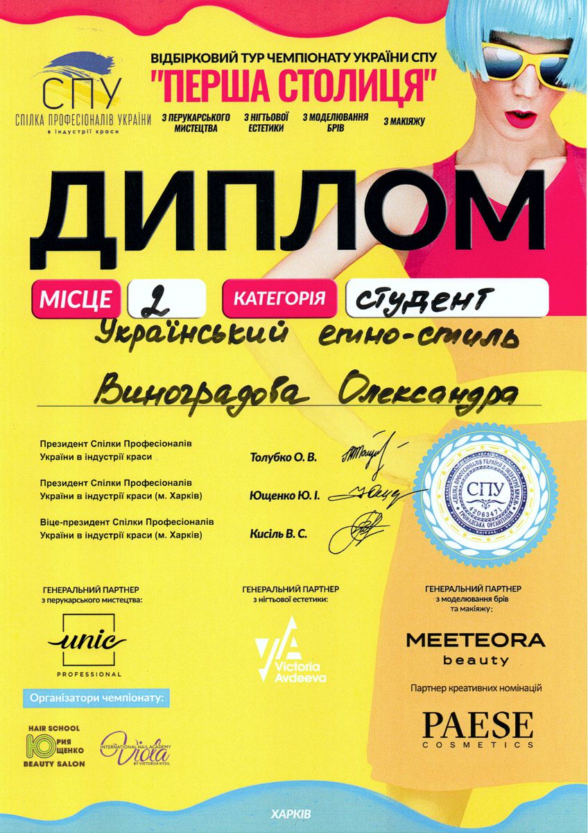 - Волошина Аріна – 3 місце в номінації «Фантазійна зачіска з елементами пастижерних виробів»