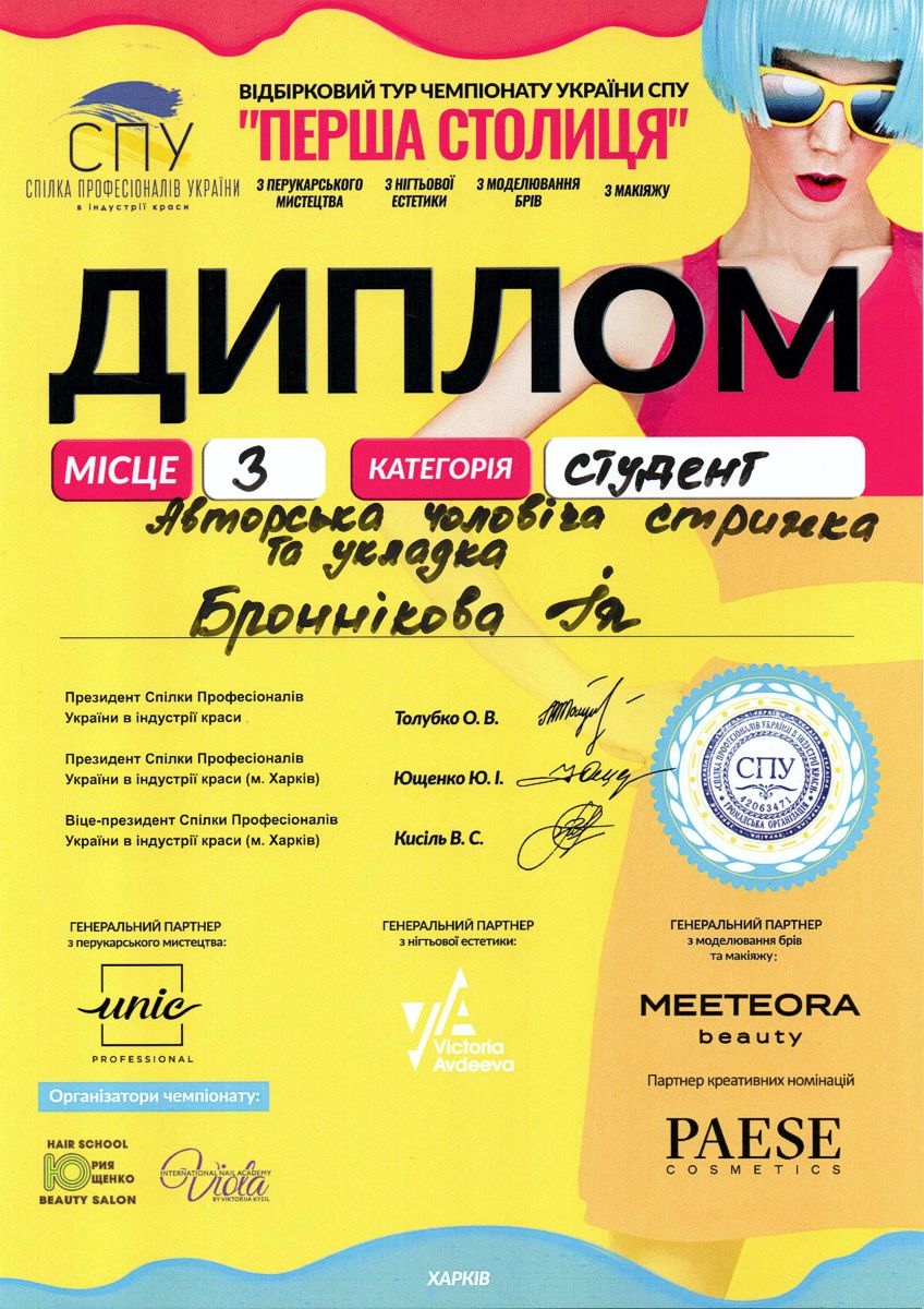 - Броннікова Ія – 3 місце в номінації «Авторська чоловіча стрижка та укладка»