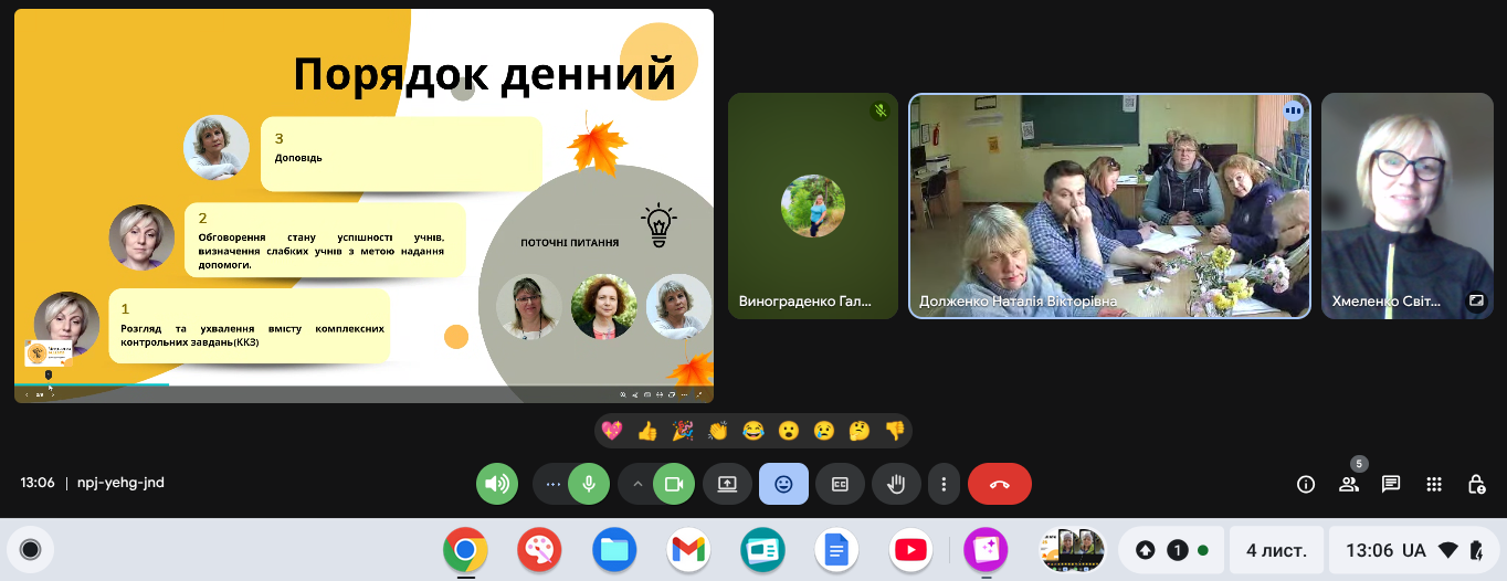 У своїй доповіді Хмеленко С. Ф. також представила результати моніторингу успішності учнів груп 2-24, 4-24, 4-23, 19-23, проаналізувала відвідування онлайн-занять і рівень якості знань за вересень-жовтень 2025–2026 навчального року.